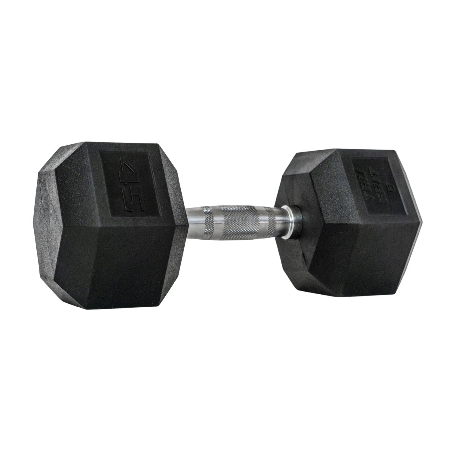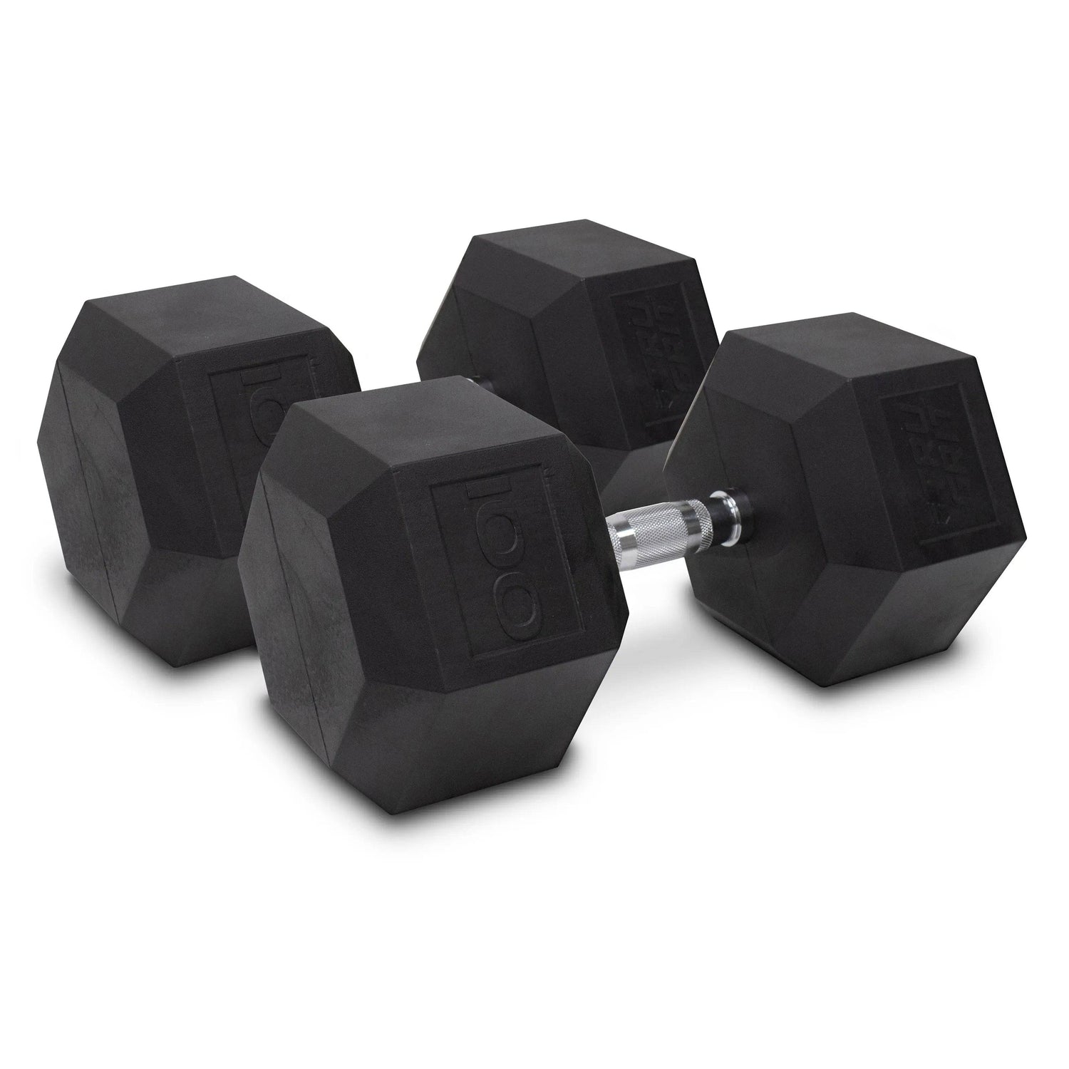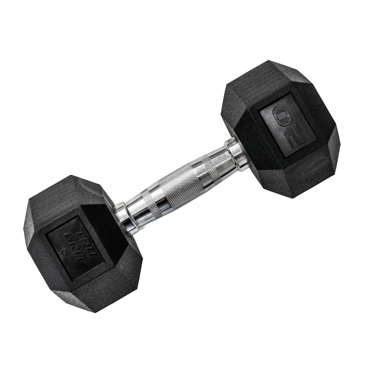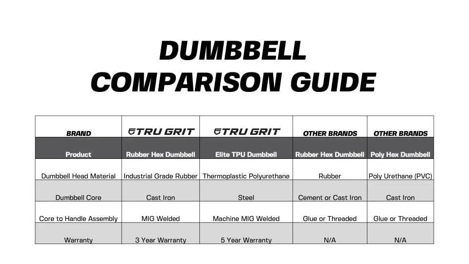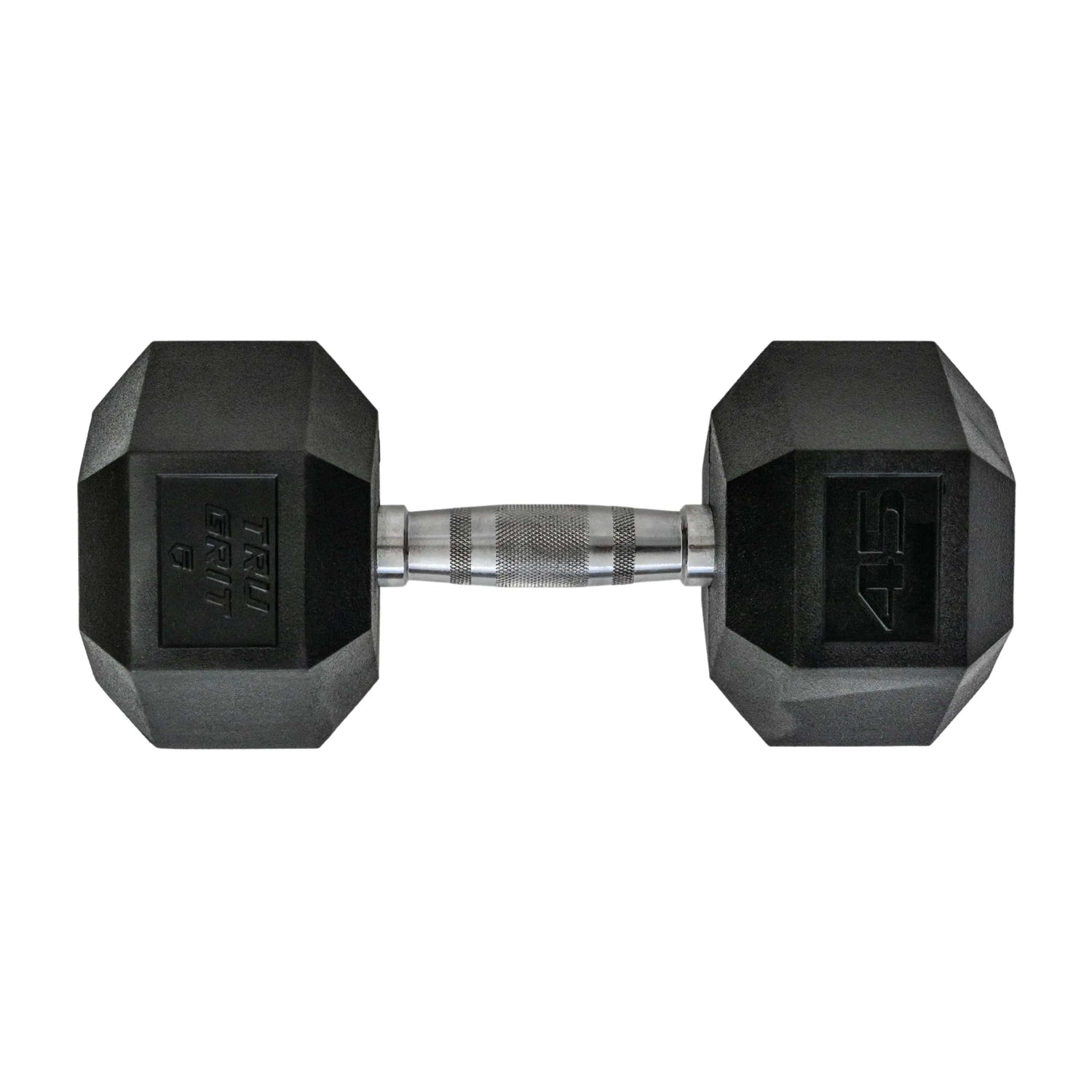 Sold in pairs and available in sizes from 2.5LB to 125LB. The Tru Grit Hex Elite Dumbbells are one of the most versatile weights of equipment in any gym or workout. Each pair of the Elite Dumbbells features a solid steel handle and heads that are fully welded on both inside and outside that won't bend or break. Durable heavy duty thermoplastic heads are oil and grease resistant which will withstand repeated impact. The hexagonal shape makes them easy to store and keeps them from rolling, and they are great for dumbbell snatch or devil's press.