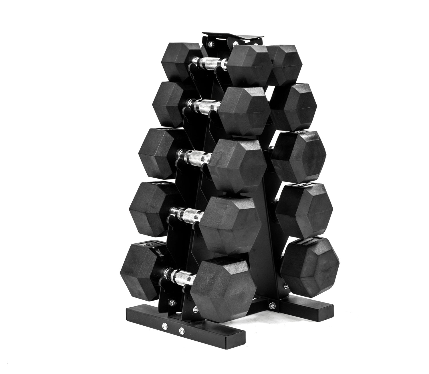The Tru Grit A-Frame Kit is a perfect fit for any gym. The kit includes 5 pairs of our Hex Elite Dumbbells (Sizes 5,10, 15, 20, and 25) plus the A-Frame rack.
