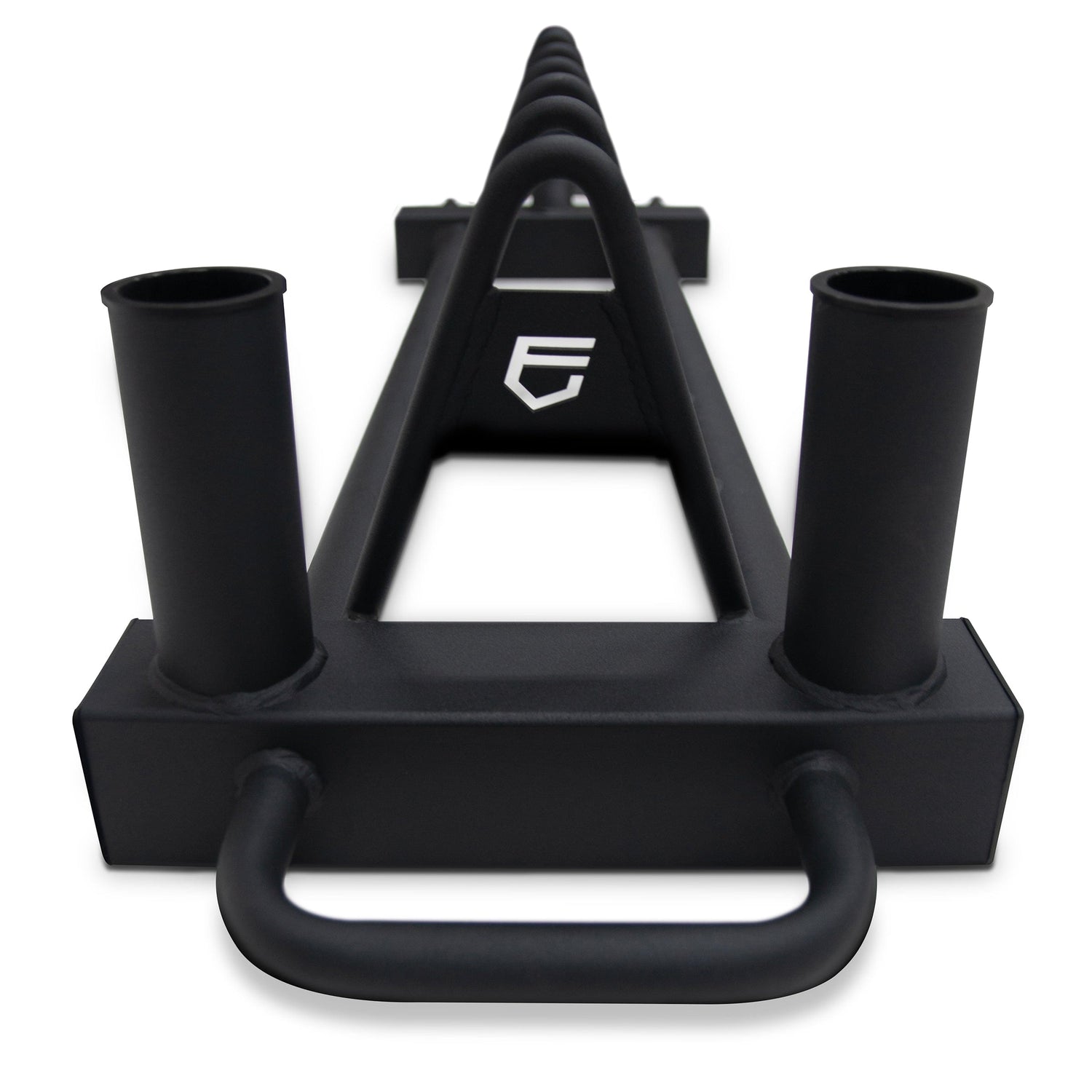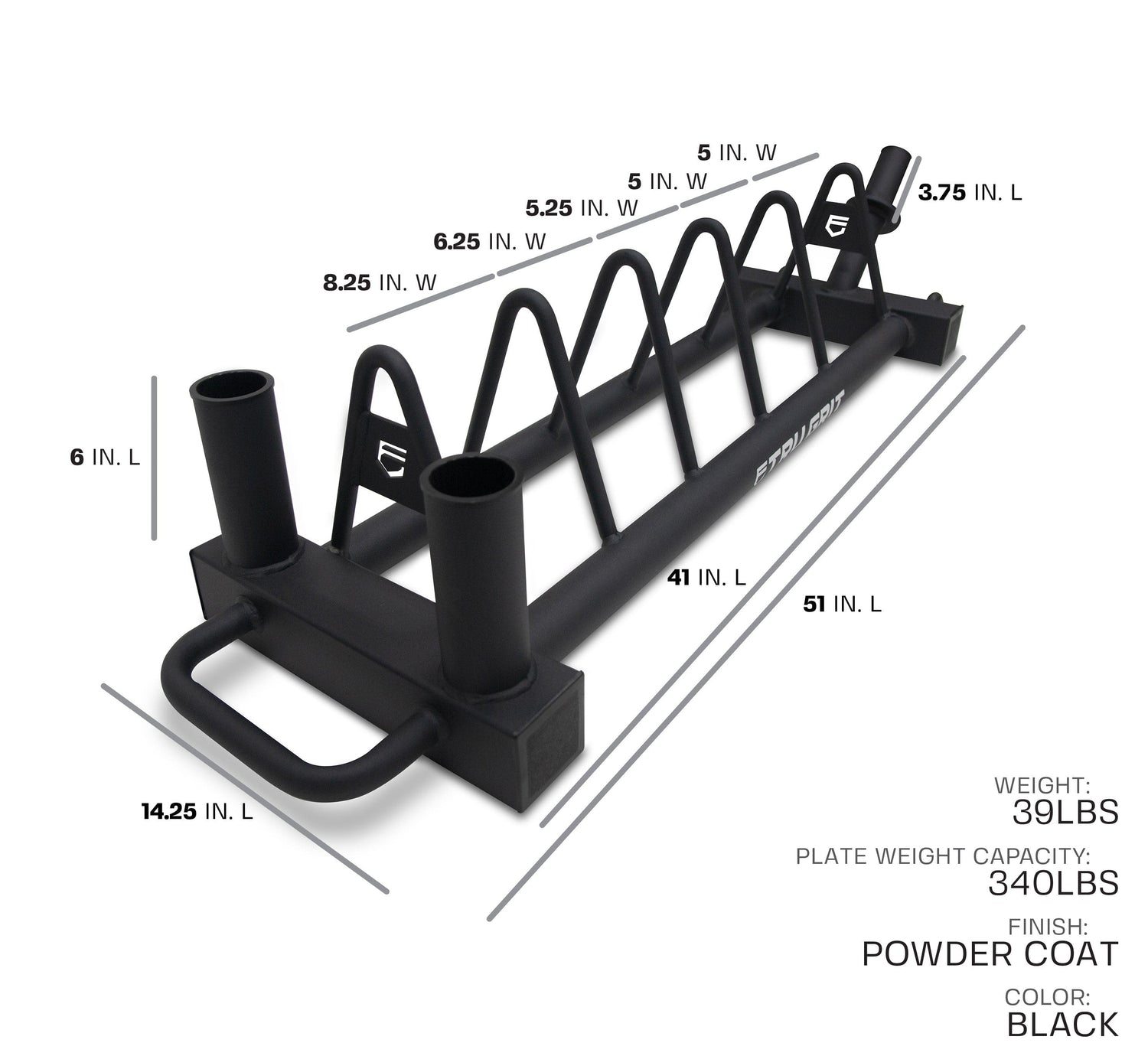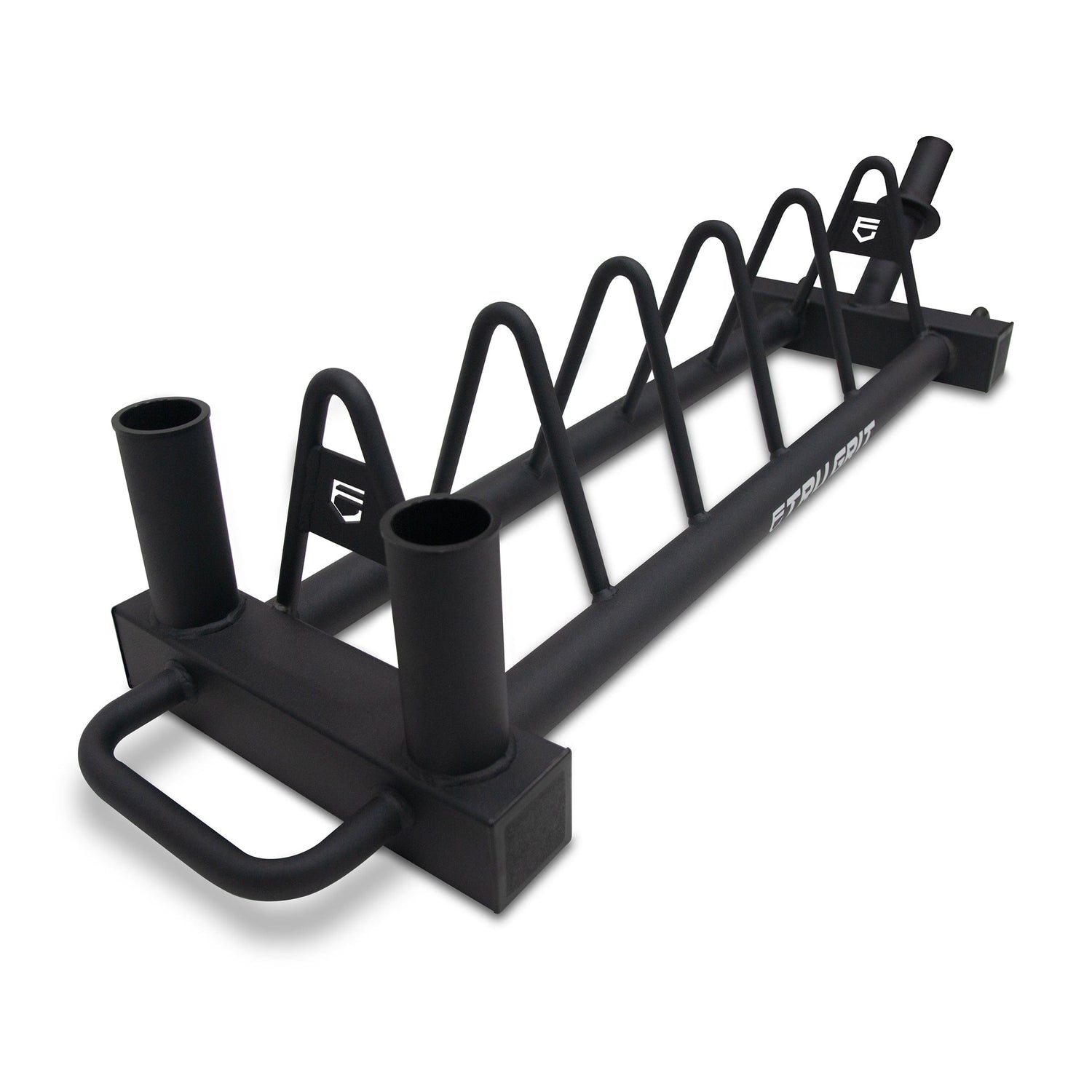 This storage rack is made from industrial grade steel and powder coated black to be resistant to sweat and moisture. The Horizontal Storage Rack has six dividers to hold pairs of plates from 10LB to 45LB. This storage rack has a storage post to store your change plates along with dual barbell storage slots so you can now store your barbells on the same storage rack as your plates. The barbell storage slots have plastic inserts to protect the sleeves of your barbell.
